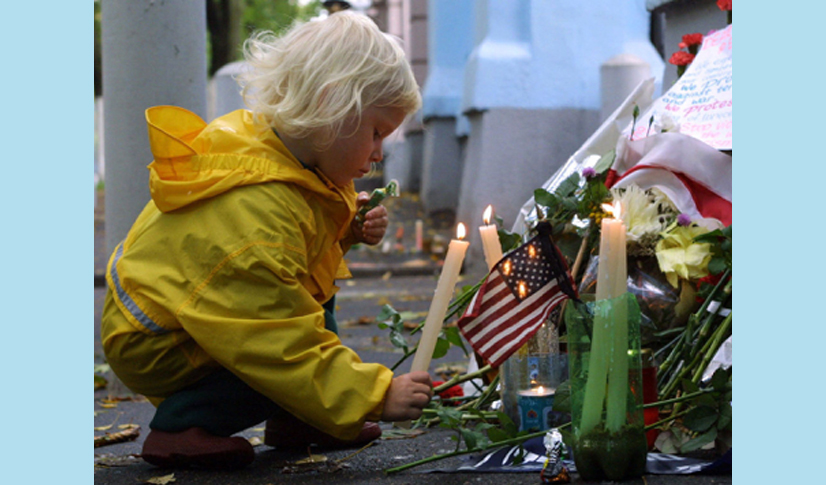 The pain of the 9/11 attacks were felt by many people all around the world, old and young. Here, three-year-old Ruzhana Vecherko lights a candle outside the U.S. Embassy in Minsk, Belarus on September 12, 2001.
