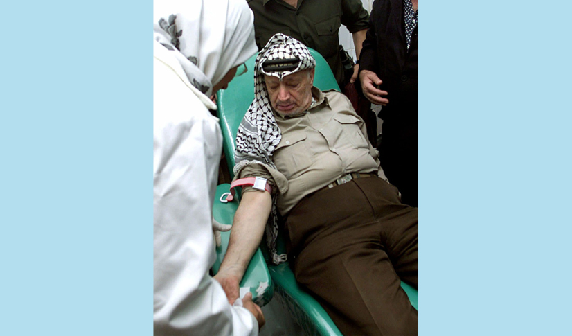 Palestinian leader Yasser Arafat donates blood at Shifa Hospital in Gaza City in a show of solidarity with America and the victims of the 9/11 terrorist attacks.